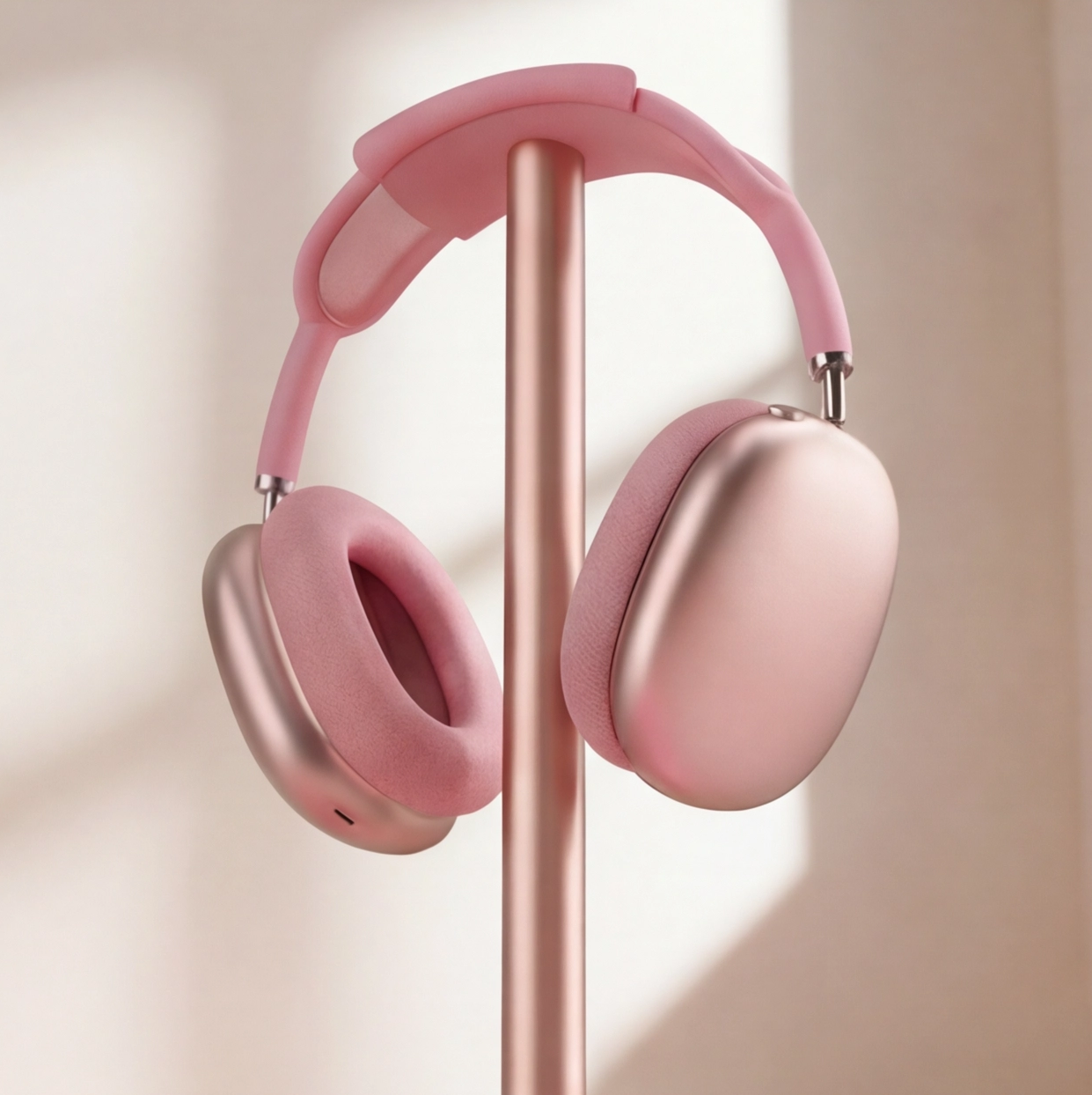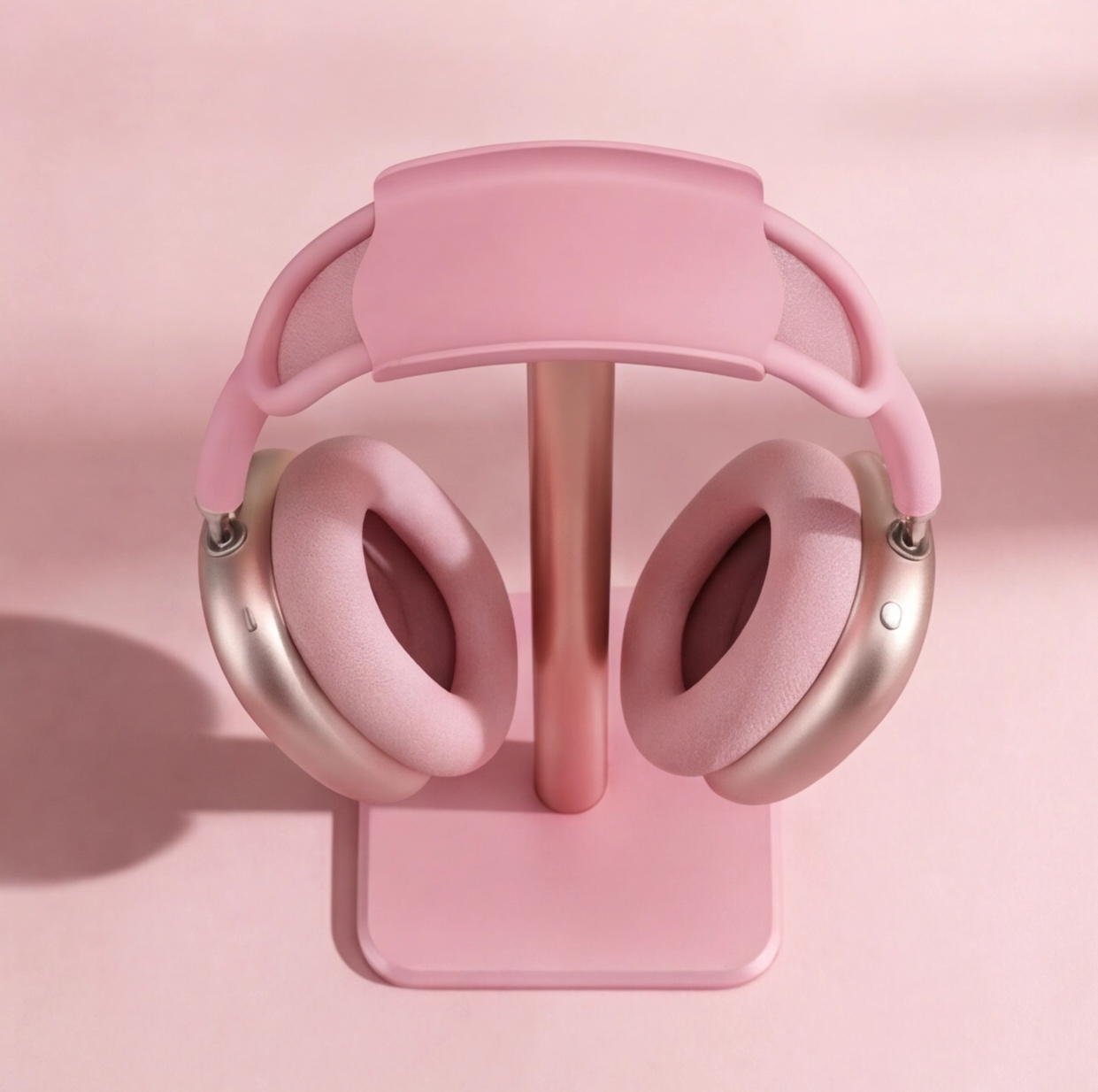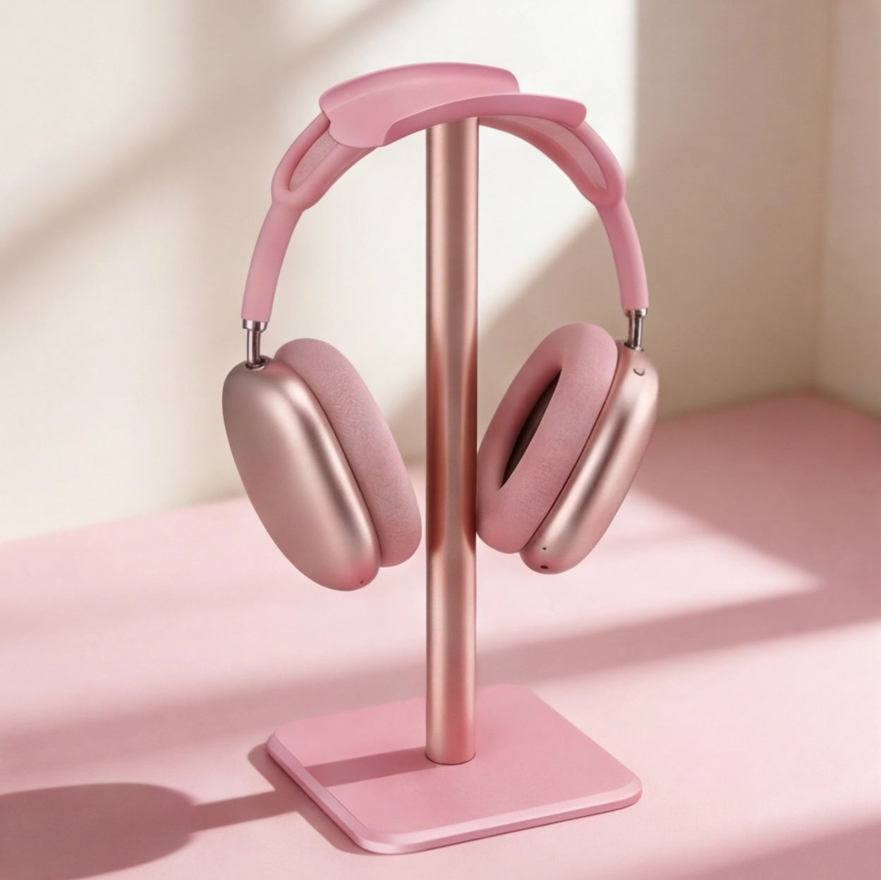 A sleek and minimal headphone stand designed to keep your desk clean and organized. Its curved support gently holds your headphones while the sturdy aluminum base ensures stability and durability.