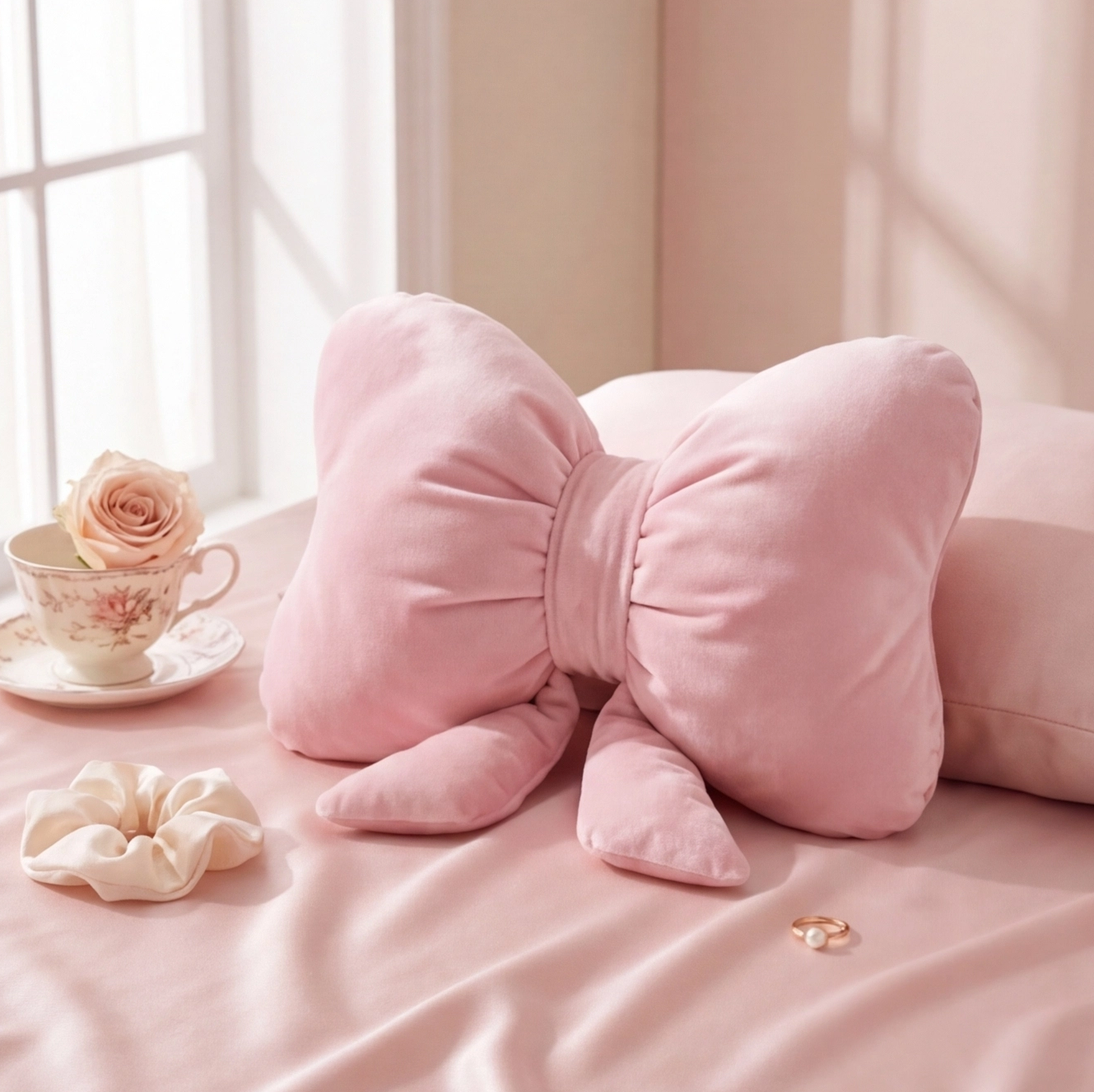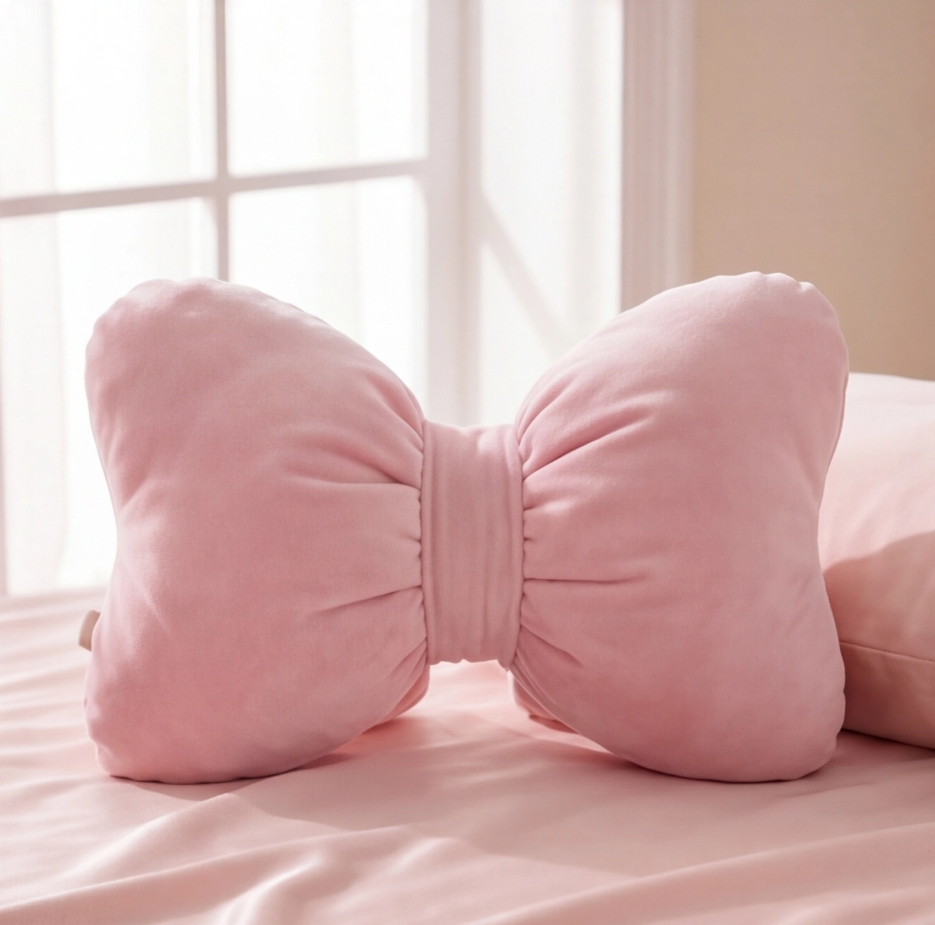 A dreamy plush bow pillow designed to add instant charm to your bedroom or vanity space. With its soft fabric and elegant bow shape, it creates a cozy yet glamorous accent that fits perfectly in girly aesthetic rooms.
